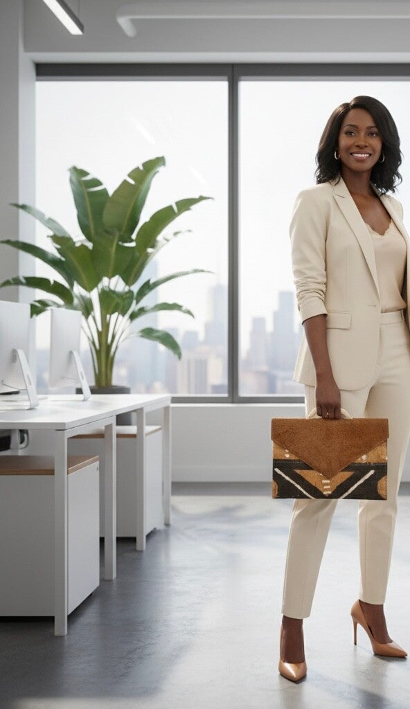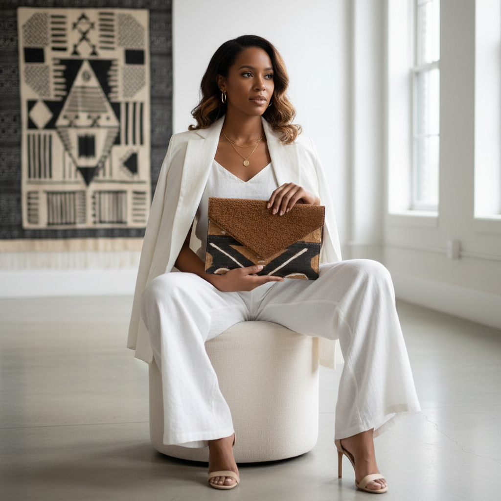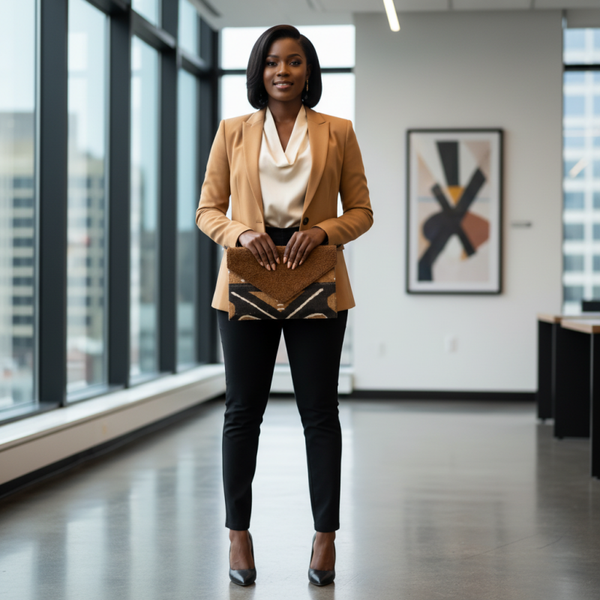 Une Pochette de type enveloppe, bimatière, conçue à Montréal et cousue main par des artisans africains.